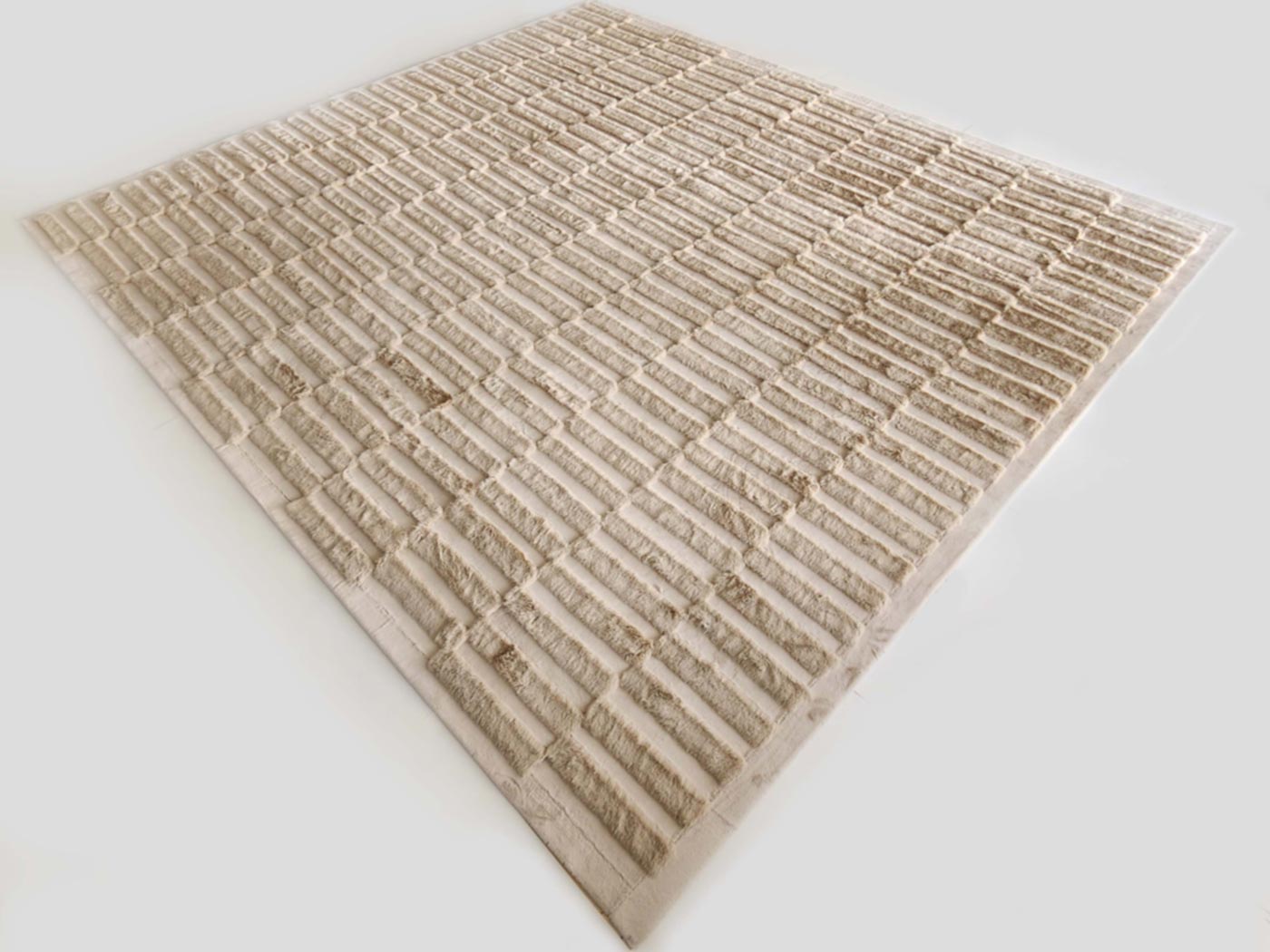 We manage the entire production cycle within our own workshop. This hands-on management allows us to ensure that every linear seam is perfectly straight and that the transition between pile heights remains seamless, regardless of the final size of the rug.
