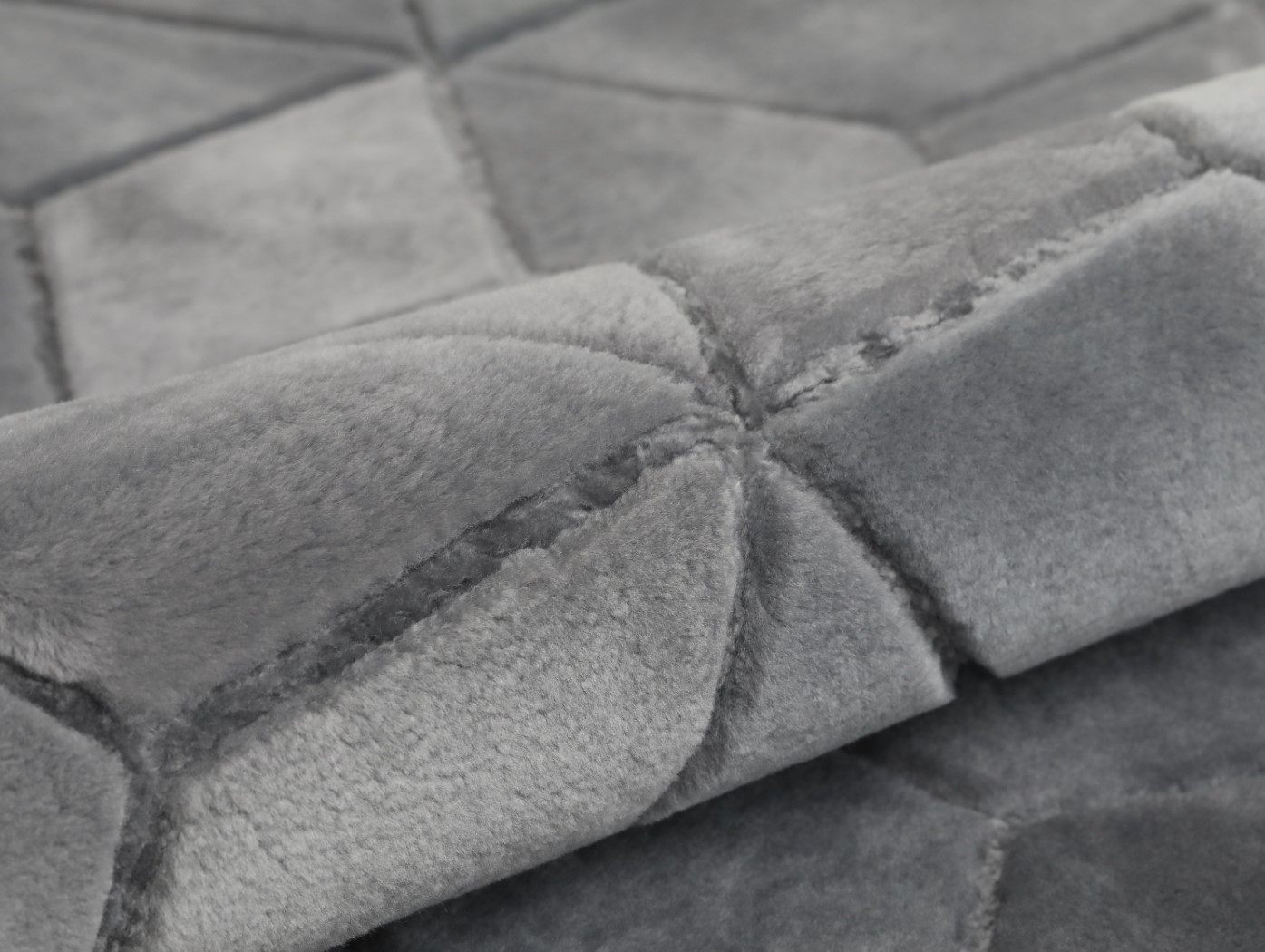 The surface of Prisma is composed of premium muton sheepskin, selected for its consistency and depth. Subtle textural transitions run through the design, gently separating each geometric form and giving the rug a layered character. These contrasts are not decorative gestures; they exist to define the pattern while preserving visual continuity. As a high end rug, Prisma avoids sharp breaks or excessive variation, maintaining a composed and architectural presence.